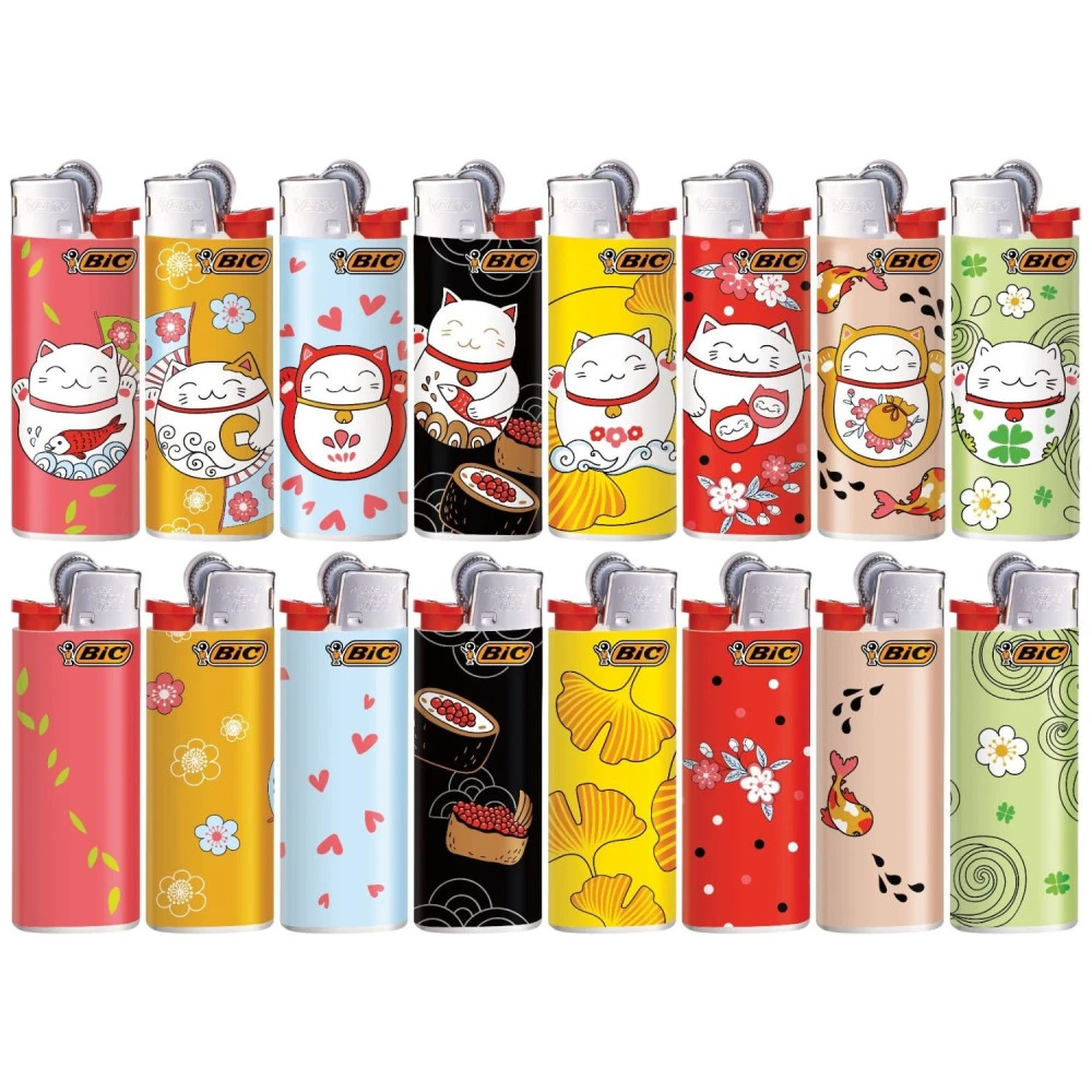 Barquette de 50 briquets BIC J25 Mini avec des illustrations de Chats dans le style Manga. Briquets à pierre et à gaz, 8 modèles différents
