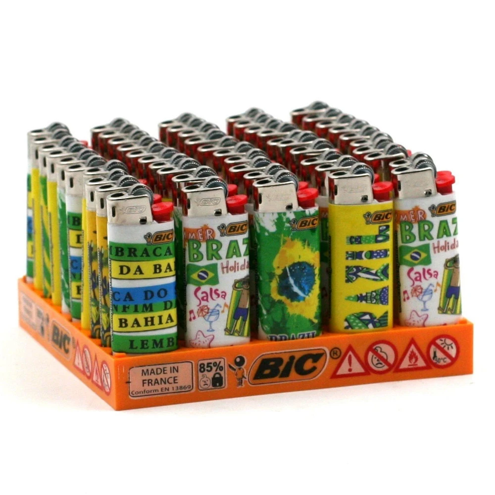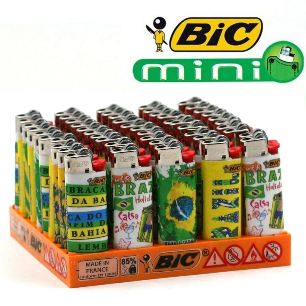 Lot de 50 briquets Mini Bic à prix discount avec illustrations.