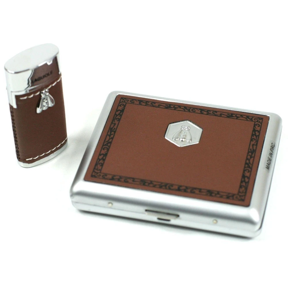 Un coffret en forme de livre ancien aux couleurs de la marque Laguiole contenant un étui à cigarettes et un briquet au gaz (rechargeable et réglable).Dimensions : 17,5 cm x 12,5 cm x 2,5 cm