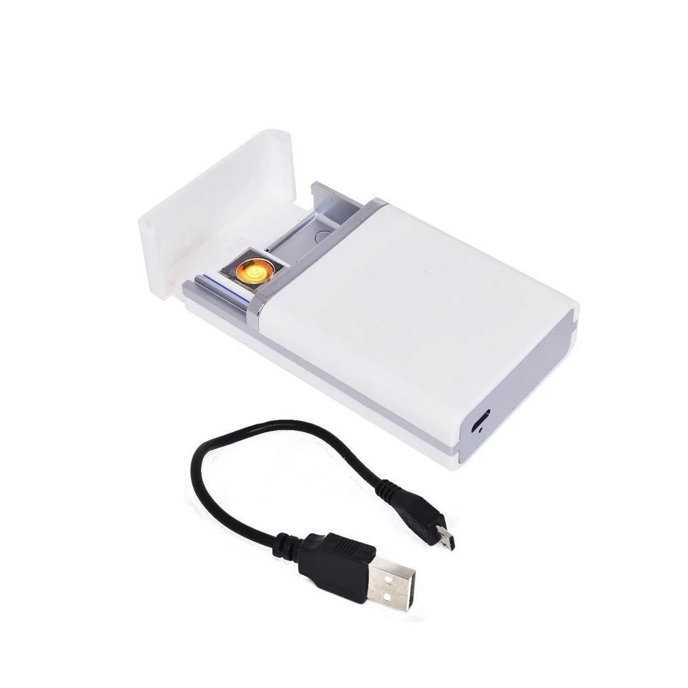 Cet étui blanc est un étui à cigarettes d’une contenance de 8 cigarettes disposant d’un allume-cigarette (ou igniteur) rechargeable par USB. A la fois pratique et esthétique ce dernier est vendu dans son coffret avec le cordon USB necessaire au rechargement du briquet USB ainsi que le mode d’emploi.Dimensions (Coffret) : 11 x 11 x 3cm Dimensions (Etui) : 5,5 x 9 x 2 cm