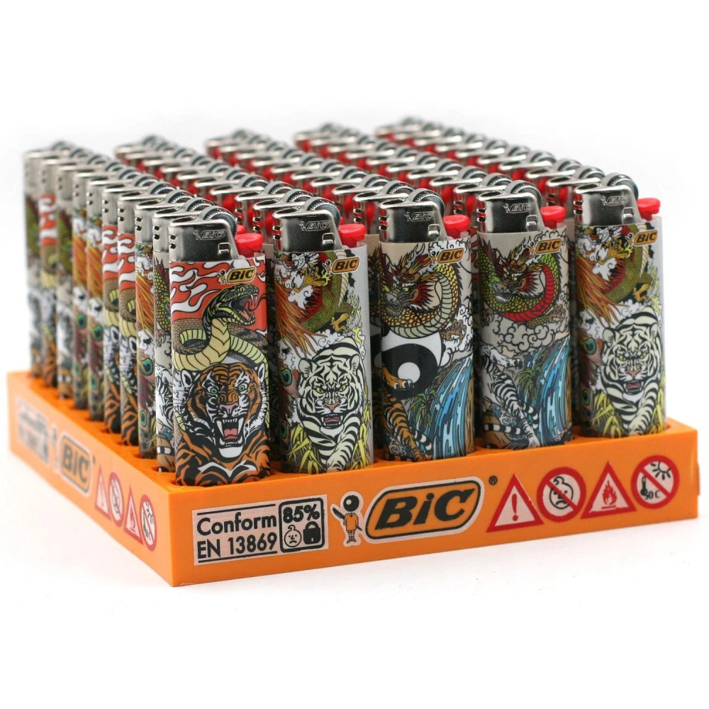 Plaquette complète avec 50 briquets BIC J26 (grand format) dans le style des tatouages Japonais. Avec 4 modèles différents comprenant chacun une illustration originale. Venez découvrir cette collection et ses illustrations avec des dragons et des tigres